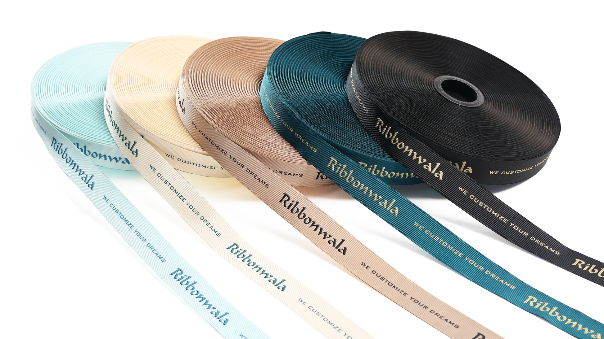 Textured grosgrain ribbon with sharp ink print — a bold, professional look for packaging.