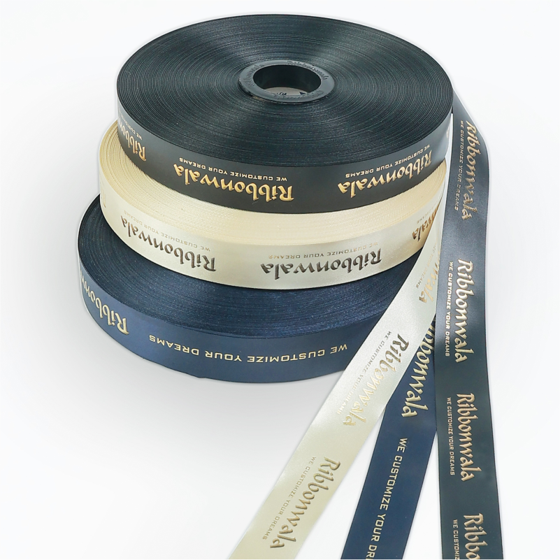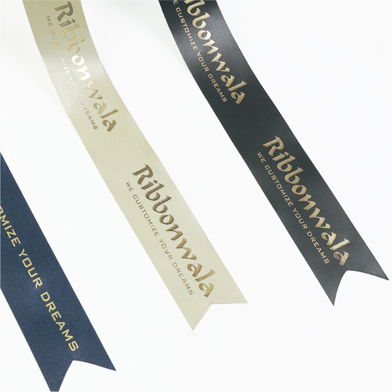 Shiny satin ribbon with metallic foil imprint — refined branding with luxurious impact.